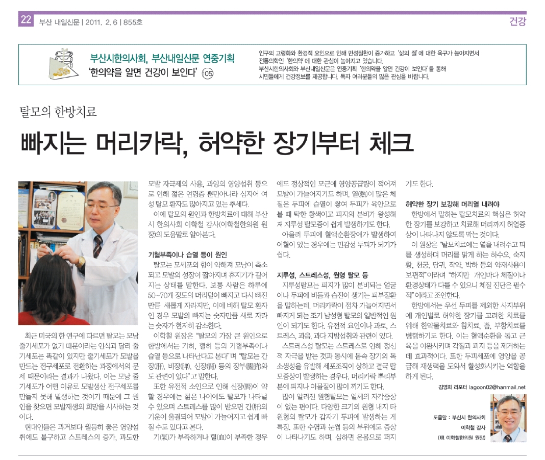 유전적 소인으로 인해 신장(腎)이 약할 경우에는 젊은 나이에도 탈모가 나타날 수 있다고 봅니다.